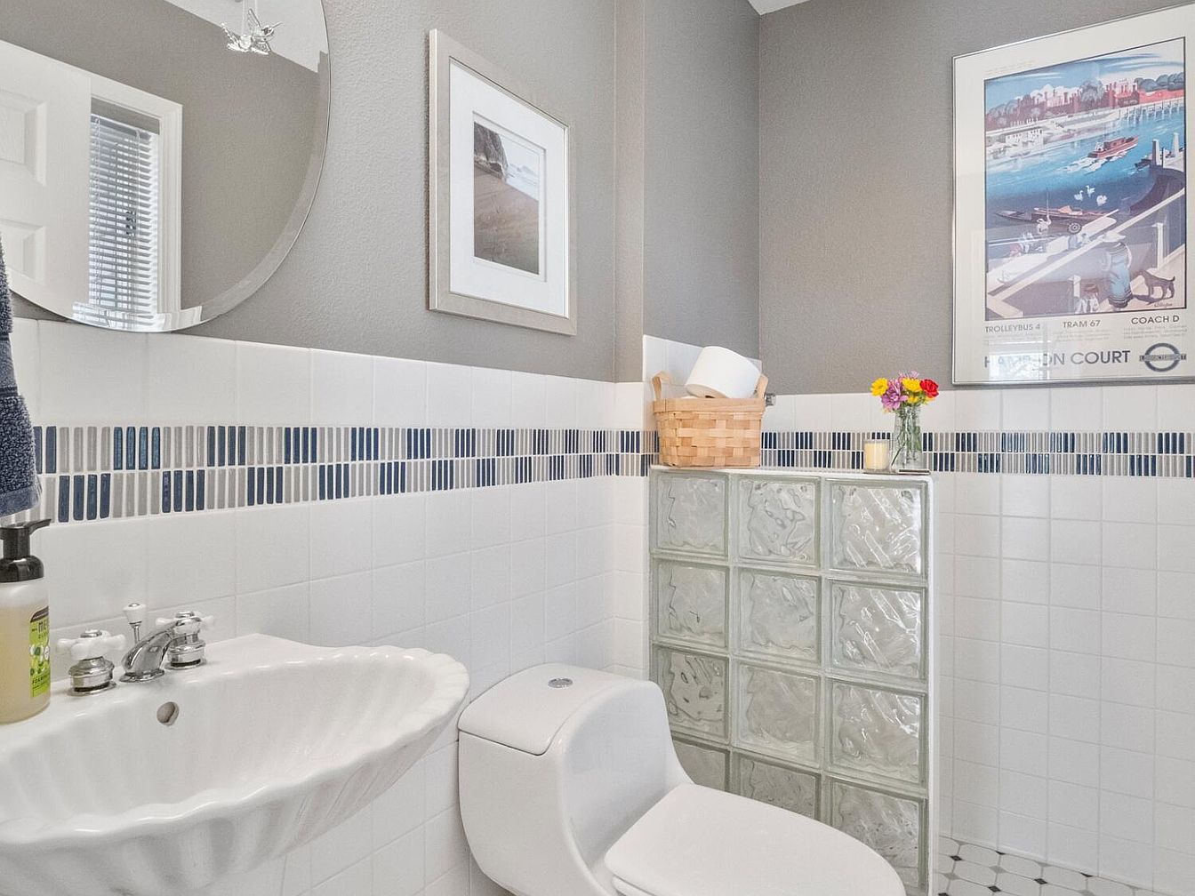 This compact bathroom features a soothing gray and white color palette that creates a clean, modern ambiance. The walls are painted a soft gray above white tiled wainscoting accented by a decorative strip of blue and gray mosaic tiles, adding visual interest. A uniquely shaped, shell-like wall-mounted sink provides a stylish focal point, paired with a sleek white toilet. A small glass block partition offers subtle division without sacrificing light. Framed artwork brightens the space, while a wicker basket with a spare roll and a vase of colorful flowers add warmth and charm to the design.
