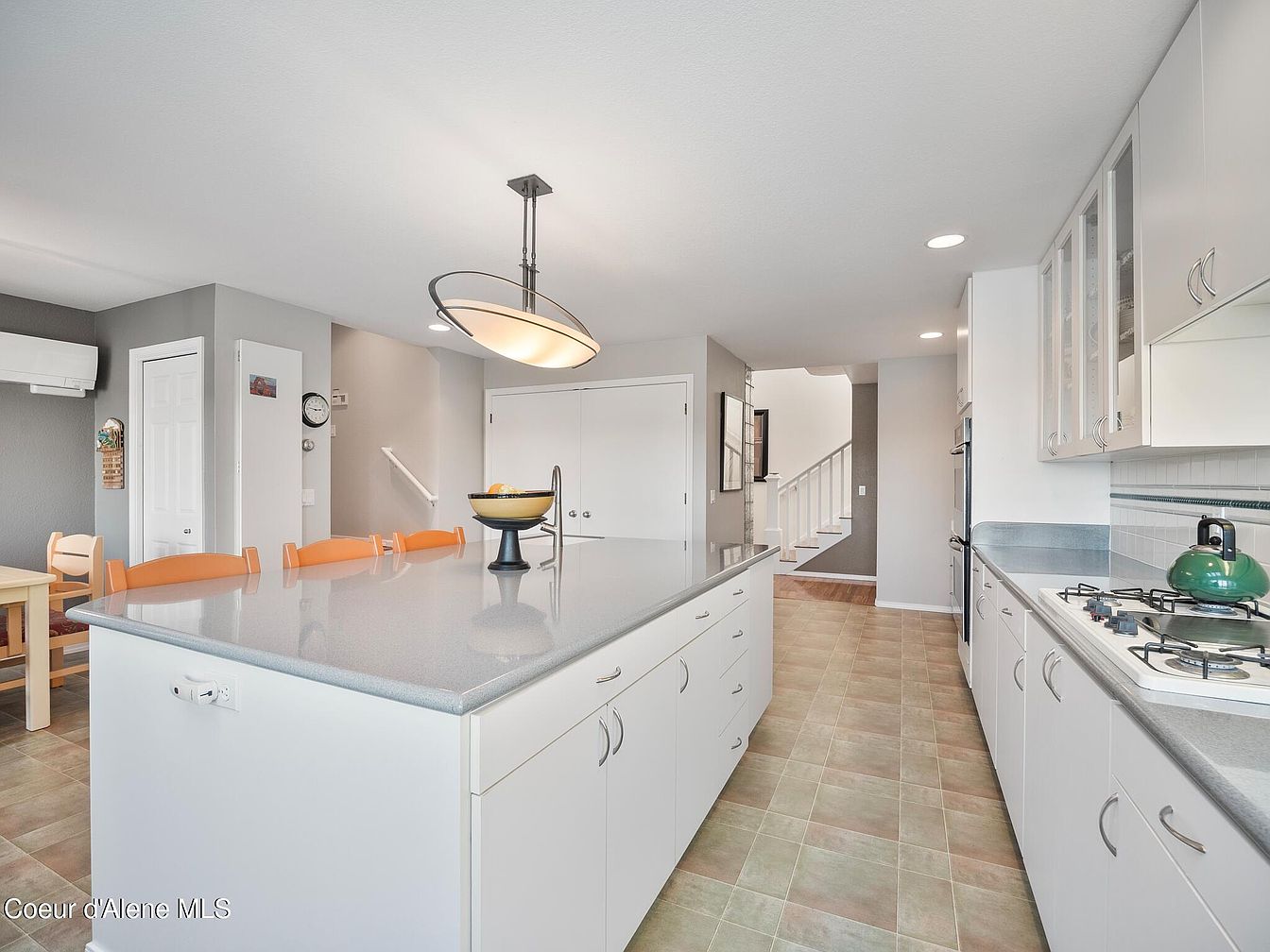 This kitchen features a clean, modern aesthetic with a spacious island at the center, topped with a smooth light gray countertop that complements the soft neutral tones throughout the room. The island includes ample storage cabinets with silver handles and is paired with bright orange chairs that introduce a lively pop of color. Against the far wall, white cabinetry stretches along the right, housing a gas cooktop and built-in appliances, creating a streamlined look. The flooring is a warm, beige-toned tile that adds subtle texture, while the light gray and white walls enhance the space’s brightness. A contemporary pendant light hangs above the island, providing focused illumination and adding an elegant design touch. The open layout flows towards a stairwell, hinting at seamless connectivity to other living areas.