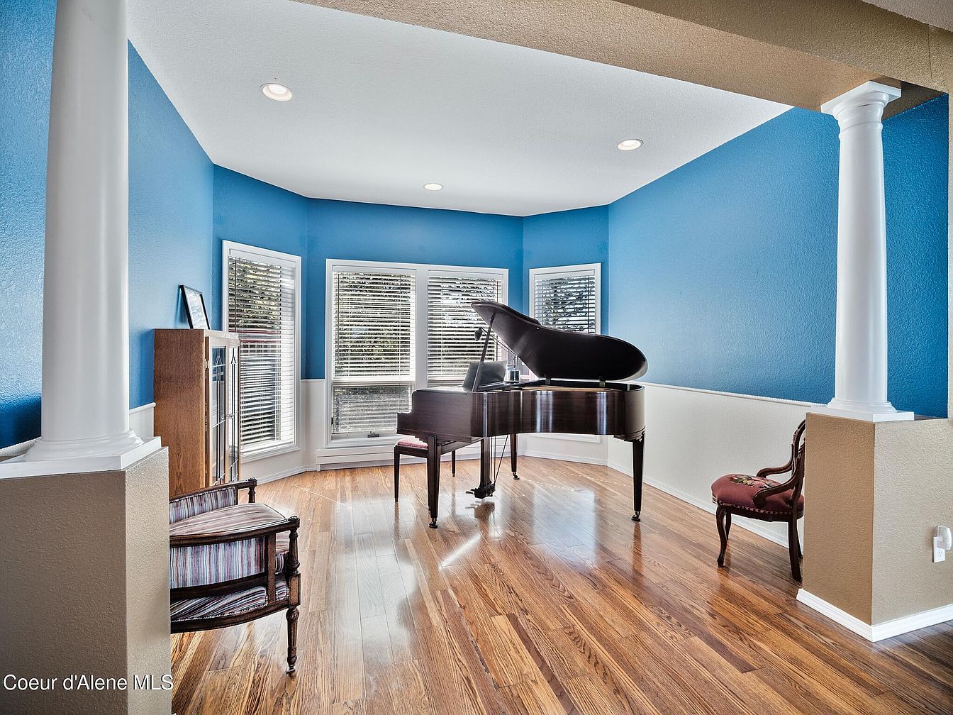 This elegant music room features a rich, dark grand piano as the focal point, positioned near expansive bay windows that flood the space with natural light. The walls are painted a vibrant blue on the upper portion, contrasted sharply by white wainscoting below, creating a fresh and inviting atmosphere. Two classic accent chairs with wooden frames and patterned upholstery offer seating while adding charm. Polished hardwood floors enhance the warm ambiance, and the ceiling has recessed lighting that complements the daylight. Architectural columns frame the entrance subtly, lending a refined and open feel to the room.