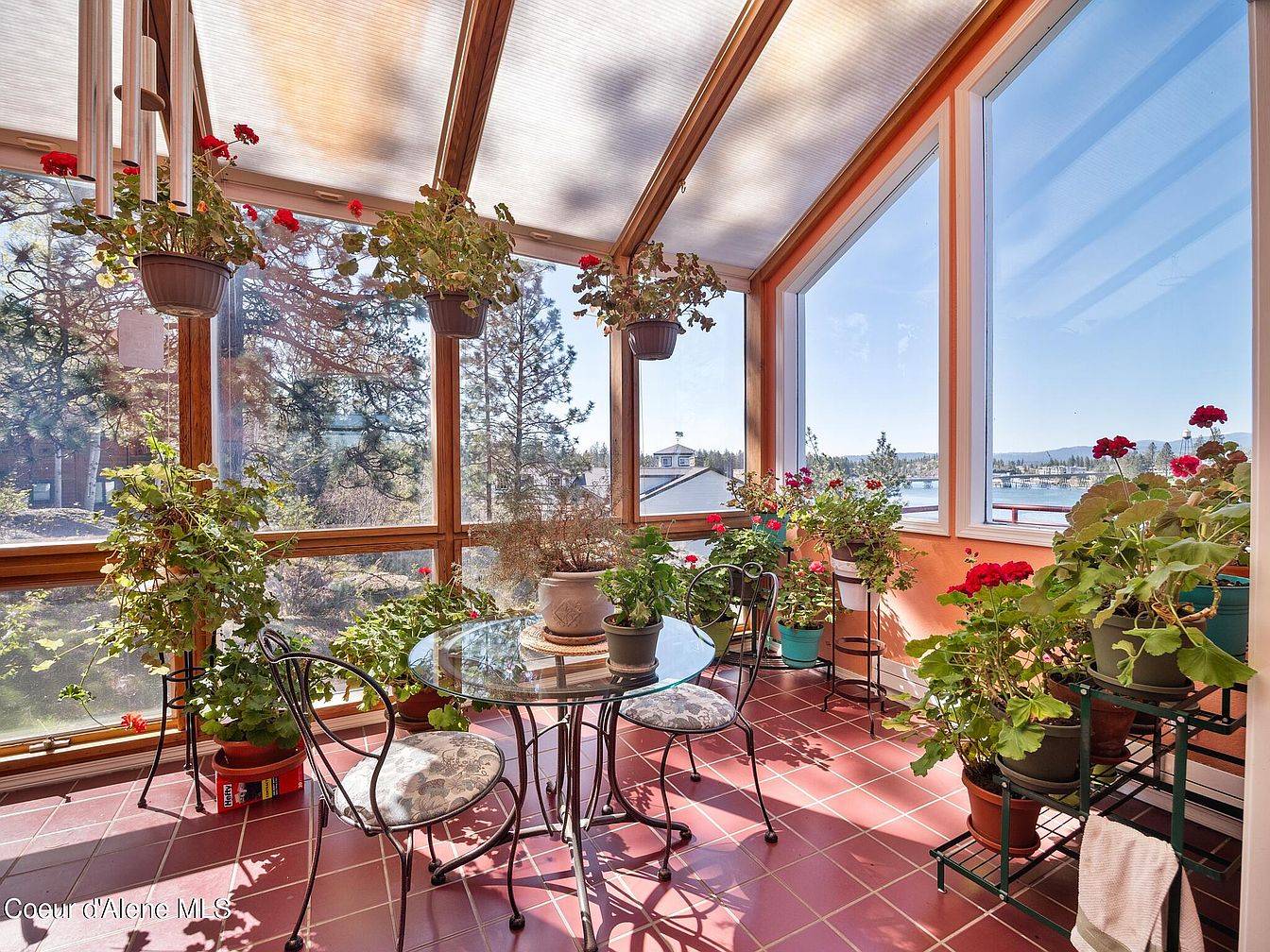 This sunroom features a warm terracotta tile floor complementing the soft peach walls, creating an inviting atmosphere. Large windows and glass ceiling panels flood the space with natural light, offering expansive views of a lush outdoor landscape and distant water. Black wrought-iron furniture with cushioned seats in neutral floral patterns adds vintage charm while maintaining comfort. Numerous potted plants and hanging flower planters contribute vibrant green and red hues, enhancing the room’s serene garden feel. The careful blend of natural elements and cozy seating makes this space perfect for relaxation and enjoying nature indoors.