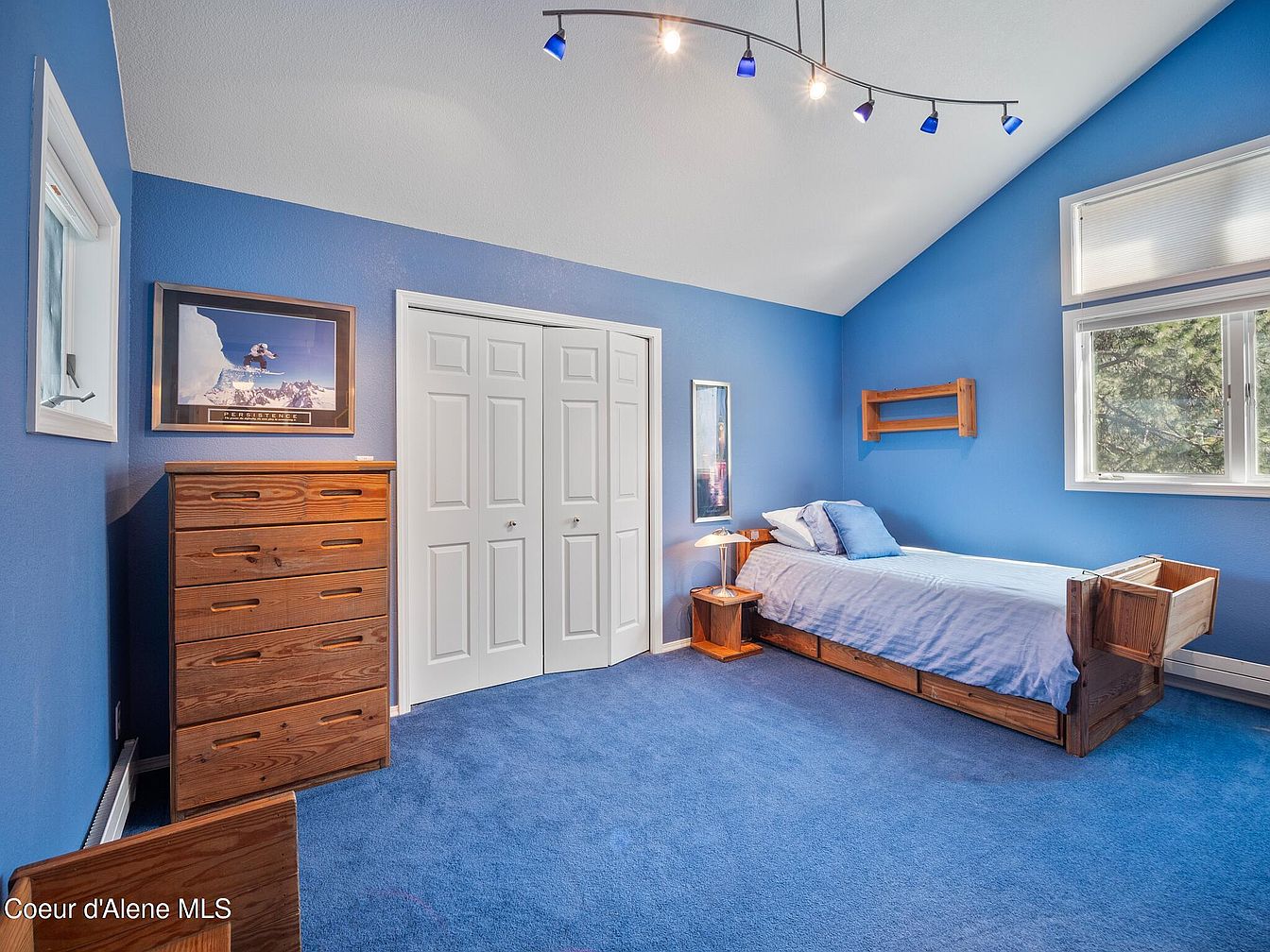 This cozy bedroom features a cohesive blue color scheme, with walls and plush carpeting both in vibrant blue tones. The ceiling slopes gently, adding architectural interest to the space. Furnishings include a wooden single bed adorned with light blue bedding and complemented by a matching pillow. Adjacent to the bed is a small wooden side table with a modern lamp. A tall wooden dresser with a natural finish adds warmth and contrast along one wall. White bi-fold closet doors create clean symmetry, while windows allow natural light to softly illuminate the room, enhancing the calm atmosphere.