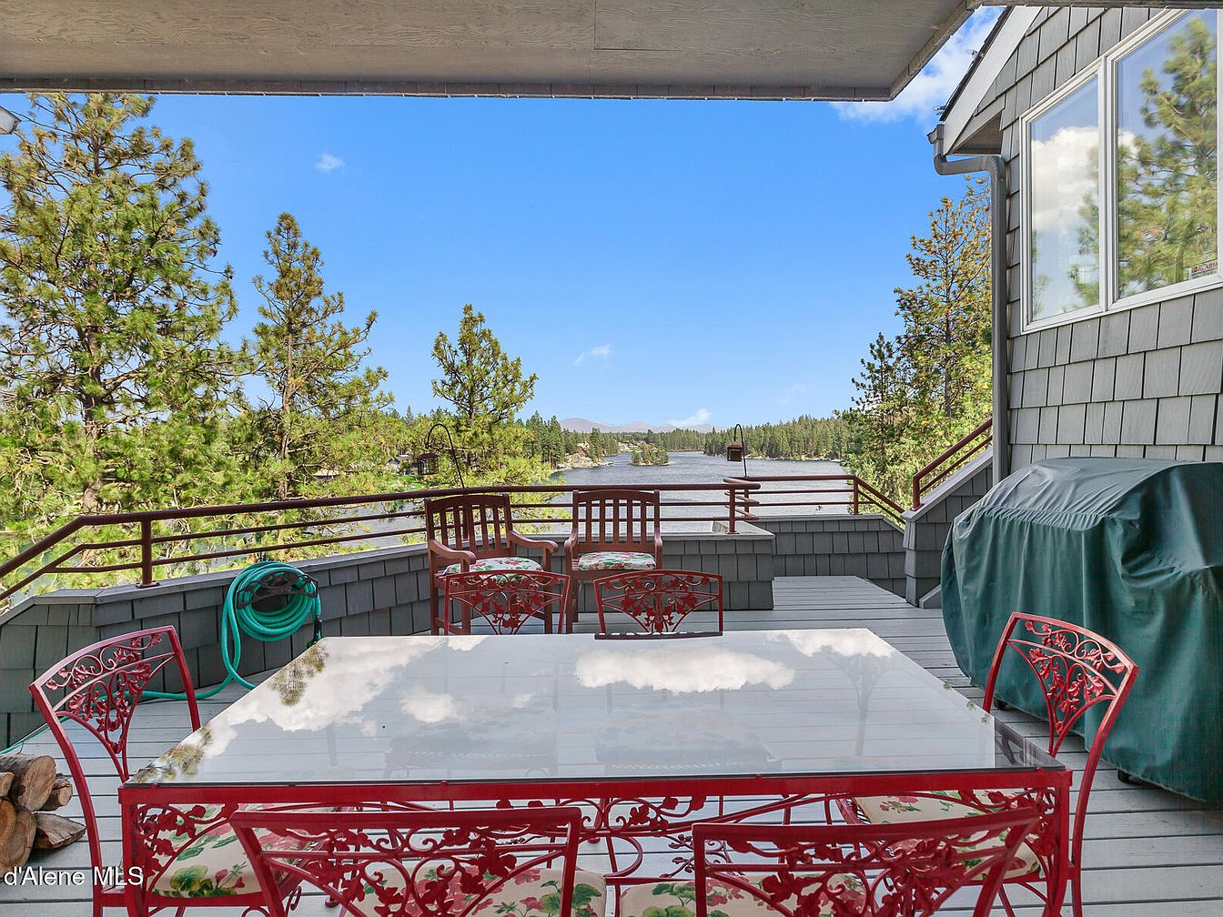 This spacious outdoor deck offers a serene lakeside view framed by lush pine trees and distant mountains. Featuring a glass-top dining table surrounded by intricately designed red wrought iron chairs with floral cushions, the area is perfect for al fresco meals. Two wooden chairs with matching floral cushions sit at the far end, complemented by a sturdy railing that ensures safety without obstructing the scenic vista. The deck flooring is painted a soft gray to harmonize with the house’s shingled exterior walls. A covered grill stands ready for outdoor cooking, and a garden hose is coiled neatly nearby, combining functionality with restful nature aesthetics.
