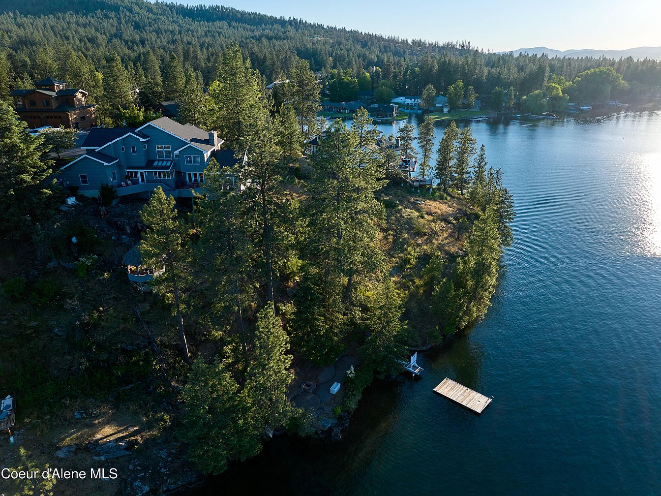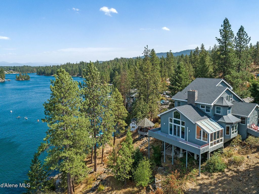 This stunning waterfront estate is nestled on a wooded peninsula, offering ultimate privacy with expansive panoramic views of a serene lake. The home is elevated on rocky terrain, surrounded by tall pine trees that create a natural barrier and blend seamlessly with the tranquil environment. The blue-gray exterior adds a modern yet rustic charm, complementing the natural landscape. A private dock extends into the calm waters, ideal for boating or relaxing by the lake. The property reflects a harmonious blend of nature and refined living, perfect for peaceful lakeside retreats.
