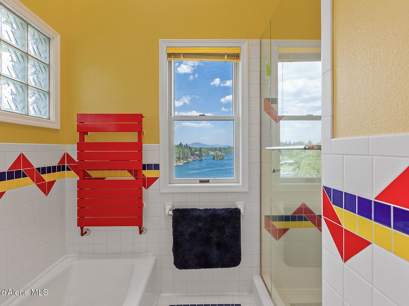 This bathroom features bright yellow walls paired with glossy white tiles, accented by bold geometric patterns in red, yellow, and purple that wrap around the space. A striking red towel rack adds a modern, playful touch above the white bathtub. The window offers a stunning view of a lush, forested lakeshore with blue skies and wispy clouds, enhancing the room’s airy feel. A glass shower door with matching tile detail reflects the vibrant hues. A fluffy dark navy towel hangs neatly below the window, complementing the color scheme. Design combines functionality with cheerful, artistic flair.