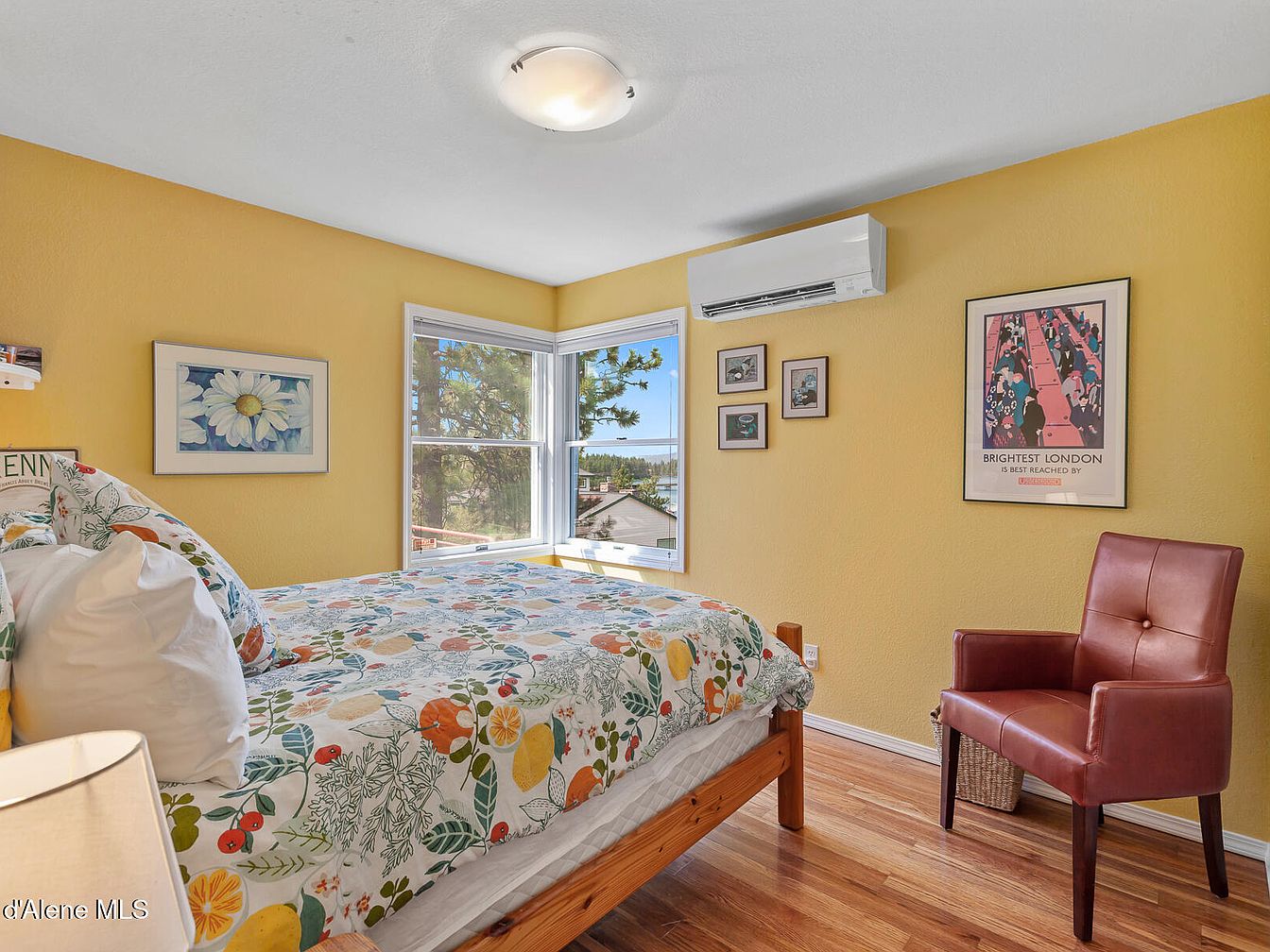 This bright bedroom corner features cheerful yellow walls that create a warm and inviting atmosphere. Natural light floods in through two large corner windows, enhancing the airy feel and framing a view of lush greenery and rooftops outside. The wooden bed frame holds a colorful bedspread patterned with fruit and floral designs, bringing playful vibrancy to the space. On the wall above a deep red leather accent chair, a collection of framed artworks adds personality and visual interest. Smooth hardwood floors complement the cozy yet lively aesthetic, while a ceiling light fixture and a modern white air conditioning unit complete the practical and comfortable setup.