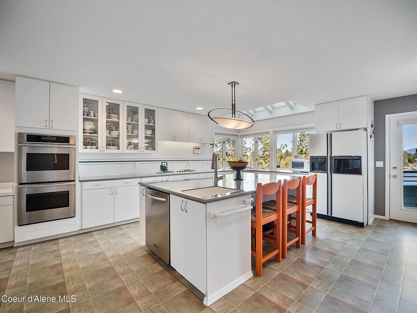 This kitchen combines spaciousness with functionality, featuring a large island in the center topped with a sleek countertop that houses a modern sink and dishwasher. Surrounding the island are four vibrant orange wooden chairs, adding a playful splash of color to the predominantly white cabinetry. The white cabinets extend across the walls with glass-front doors displaying fine dishware, complemented by subtle tiled backsplash with a thin accent stripe. Stainless steel double ovens are built-in on one side, and a double-door fridge integrates seamlessly into the design. Natural light floods the room through generous windows and a skylight, giving the space an airy, open feel, while the flooring adds earthy warmth with its muted greenish-brown tiles.