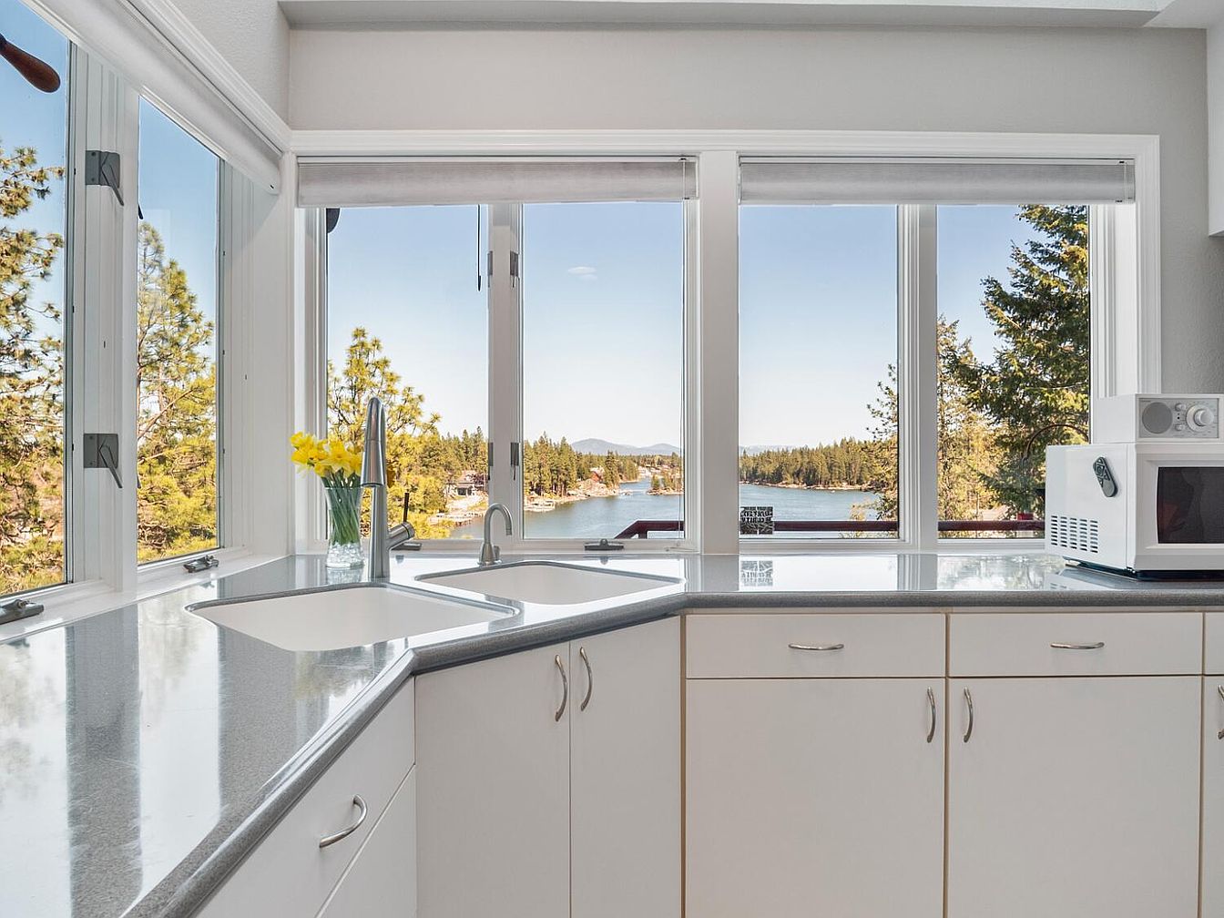 This modern kitchen corner features a sleek L-shaped countertop with a smooth, reflective finish that enhances the bright and airy ambiance. The double sinks are positioned under expansive, white-framed windows that offer an uninterrupted panoramic view of a serene lake surrounded by lush pine trees and distant mountains. The cabinetry is white with delicate silver handles, maintaining a clean and minimalist aesthetic. A small vase with fresh yellow flowers adds a touch of warmth and color. Natural light floods the space, emphasizing its tranquil connection to the outdoor scenery, making it a perfect spot for both cooking and enjoying nature.
