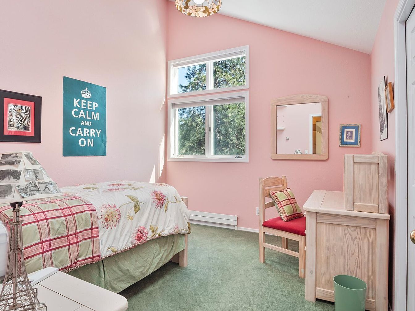 This inviting bedroom features soft pink walls that create a warm and cheerful atmosphere, complemented by a green carpet that adds a subtle touch of earthiness. A twin bed dressed with floral and plaid bedding sits to the left, accompanied by a lamp with a uniquely patterned shade on a white bedside table. The opposite wall hosts a natural wood desk with a matching wooden chair adorned with a red seat cushion and a plaid pillow, enhancing comfort and functionality. A rectangular mirror and small framed art enrich the decor, while a large double window invites plenty of natural light, showcasing a serene view of trees outside.