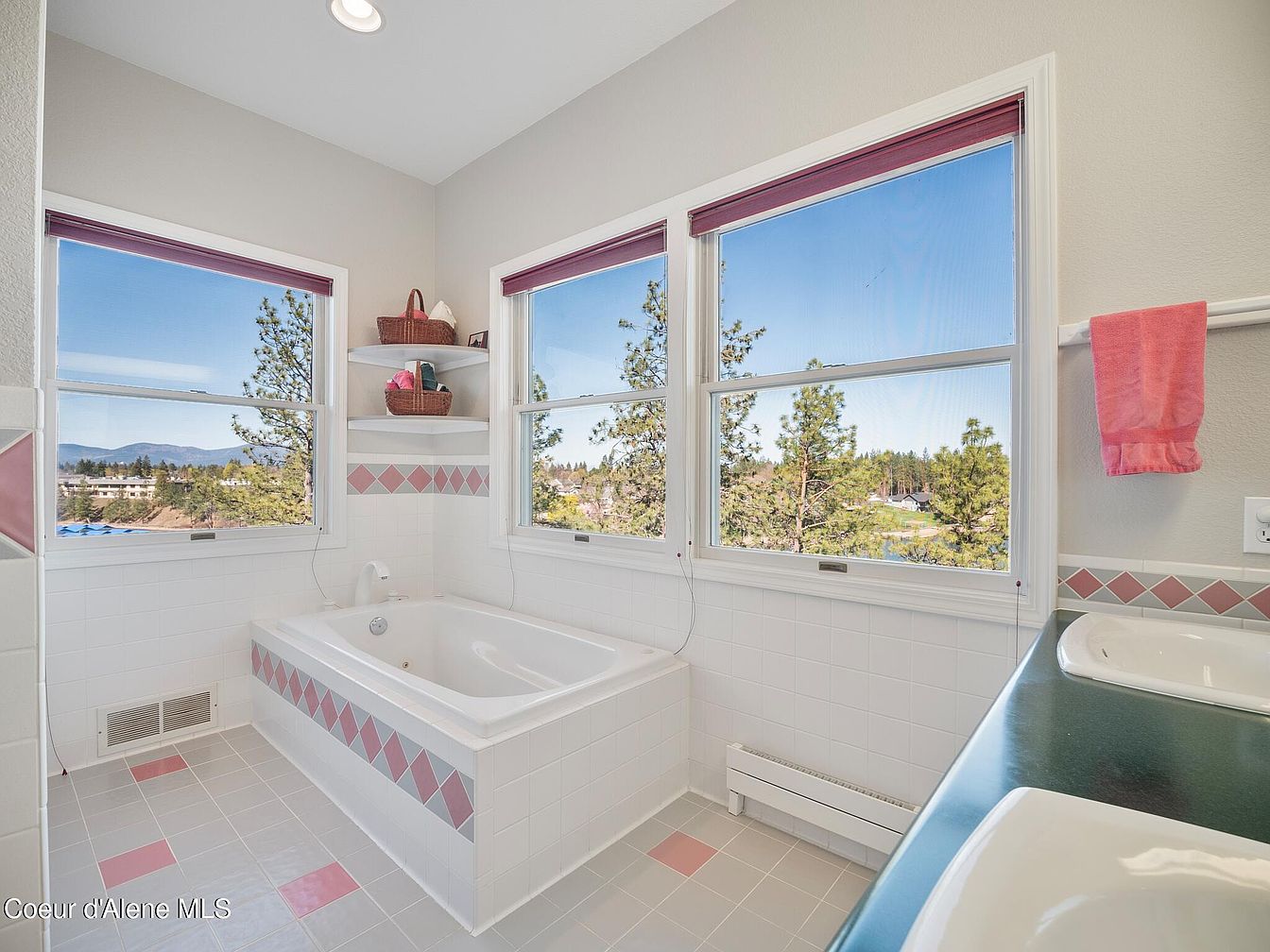 This spacious bathroom features a built-in bathtub encased in white tiles accented with a pink diamond pattern, matching the floor tiles that incorporate similar pink highlights. Three large windows surround the tub area, framing scenic views of pine trees and distant hills, flooding the room with natural light. The walls are painted a soft, neutral gray, complementing the white and pink tile scheme. A green countertop with a white sink and a pink towel add subtle bursts of color, while corner shelves hold wicker baskets, enhancing the cozy yet fresh aesthetic of the space.