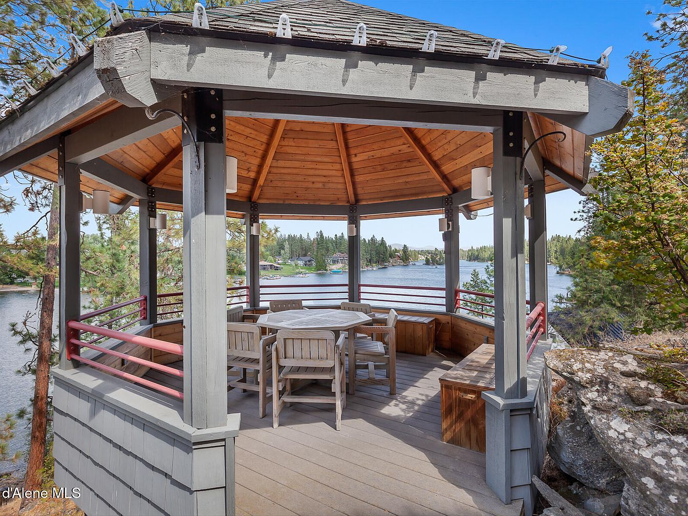 This inviting gazebo, perched on the edge of a scenic lake, provides a charming outdoor retreat. The octagonal structure features sturdy gray wooden beams and railings accented with muted red horizontal bars, blending rustic and contemporary styles. Its warm natural wood ceiling adds contrast and coziness while integrating seamlessly with the forested surroundings. Inside, a set of weathered wooden chairs encircles a matching table, creating a perfect spot for alfresco dining or socializing. The open layout frames expansive water views, enhancing the serene ambiance and offering an ideal setting for relaxation and connection with nature.