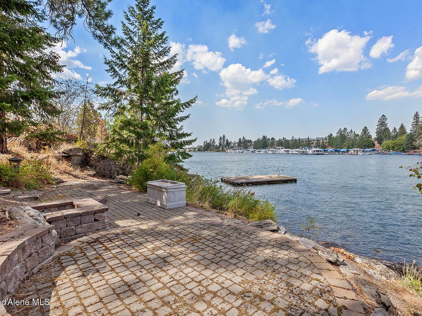This tranquil lakeside patio offers seamless access to the water with a floating dock perfect for boating or swimming. The area is paved with weathered cobblestone pavers that blend naturally with the rugged rocky terrain and surrounding greenery. Mature evergreen trees provide a sense of privacy and nature immersion. Low stone walls subtly frame the patio space, creating an inviting spot for seating or a small fire pit. The overall atmosphere is serene and rustic, enhanced by the sparkling lake, clear blue sky, and soft white clouds. A perfect retreat for outdoor relaxation and water activities.