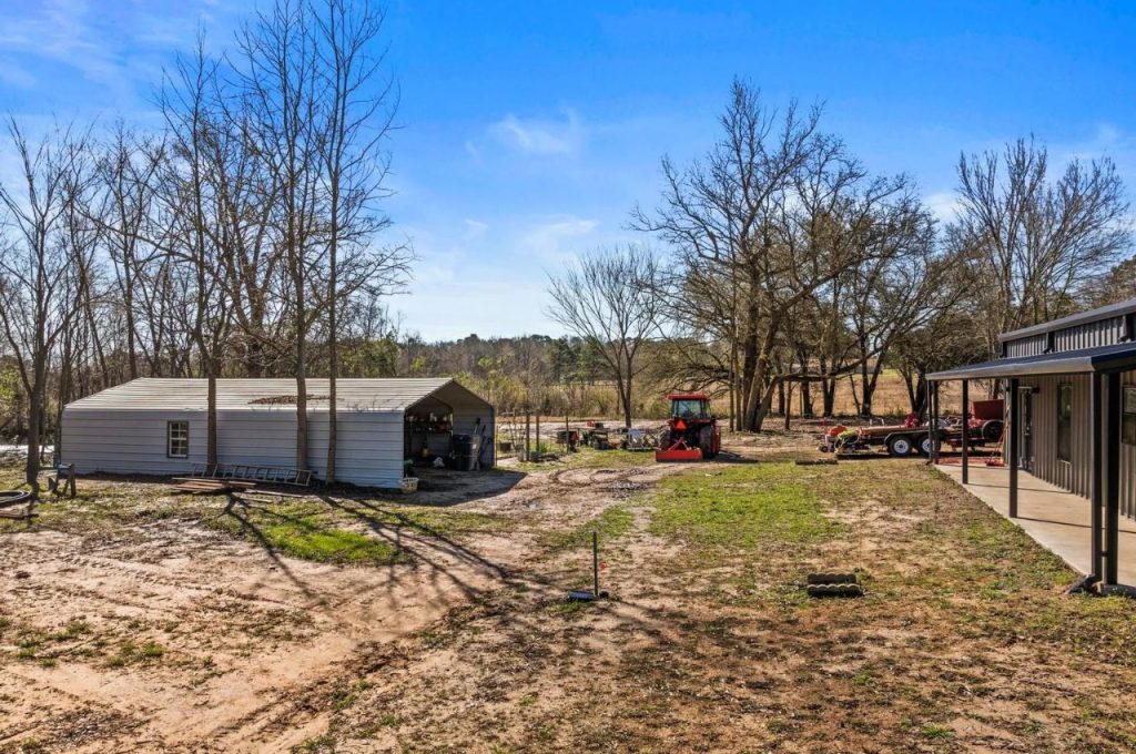This property offers a sprawling outdoor space with a functional mix of open land and wooded areas, perfect for farming or recreation. A metal storage building provides ample room for equipment, while the covered porch of the main structure extends inviting shelter. The landscape features mature trees that add natural charm, and a red tractor and trailers hint at the property’s agricultural versatility. With expansive views of the countryside, this space is ideal for those seeking a blend of practicality and serene rural living.