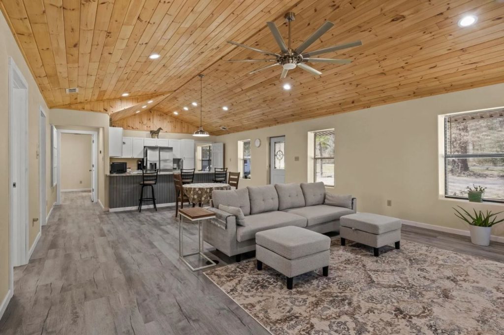 This inviting open-concept living space blends modern comfort with rustic charm. A vaulted knotty pine ceiling adds warmth and character, complemented by recessed lighting and a sleek ceiling fan. The spacious layout seamlessly connects the living, dining, and kitchen areas, creating an airy and functional flow. Neutral walls and large windows allow natural light to enhance the cozy ambiance, while wood-look flooring grounds the space in durability and style. A modern sectional and coordinating ottomans provide ample seating, making this the perfect gathering spot.