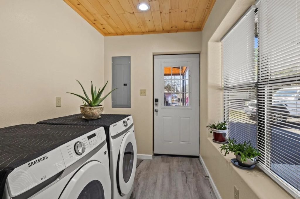 This well-lit laundry room offers both efficiency and warmth with its natural wood ceiling and neutral walls. A large double window fills the space with sunlight, enhancing the airy atmosphere, while sleek appliances ensure modern convenience. The gray wood-look flooring provides durability and complements the soft tones throughout. A glass-paneled back door allows easy access to the outside and additional light to flow in, creating an inviting feel. Thoughtful touches, like potted plants on the windowsill and atop the washer, add a refreshing natural element to this practical yet stylish space.