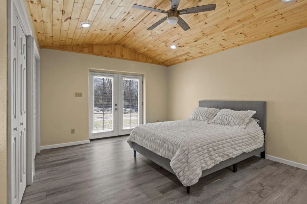 This tranquil bedroom embraces a natural aesthetic with its warm pinewood ceiling and soft beige walls. The vaulted design enhances the sense of spaciousness, while recessed lighting and a sleek ceiling fan ensure both brightness and comfort. A gray upholstered bed with a textured white comforter brings a cozy yet modern touch. The French doors allow abundant natural light to stream in, offering serene views of the outdoors. Completing the space, gray wood-look flooring adds durability and elegance, making this room a perfect retreat for rest and relaxation.