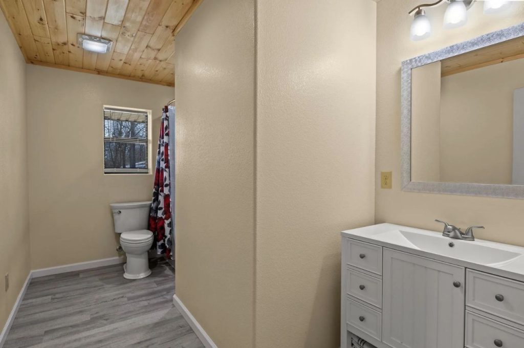 This charming bathroom blends functionality with a warm, inviting aesthetic. The natural pinewood ceiling adds a rustic touch, contrasting beautifully with the soft beige walls. A white vanity with ample storage and a stylish silver-framed mirror create a clean and classic look. Above, a three-light fixture enhances brightness. The gray wood-look flooring ties the space together with a modern appeal. A separate toilet and shower area, partially hidden, offers privacy, while a floral-patterned shower curtain adds a pop of color to this thoughtfully designed space.