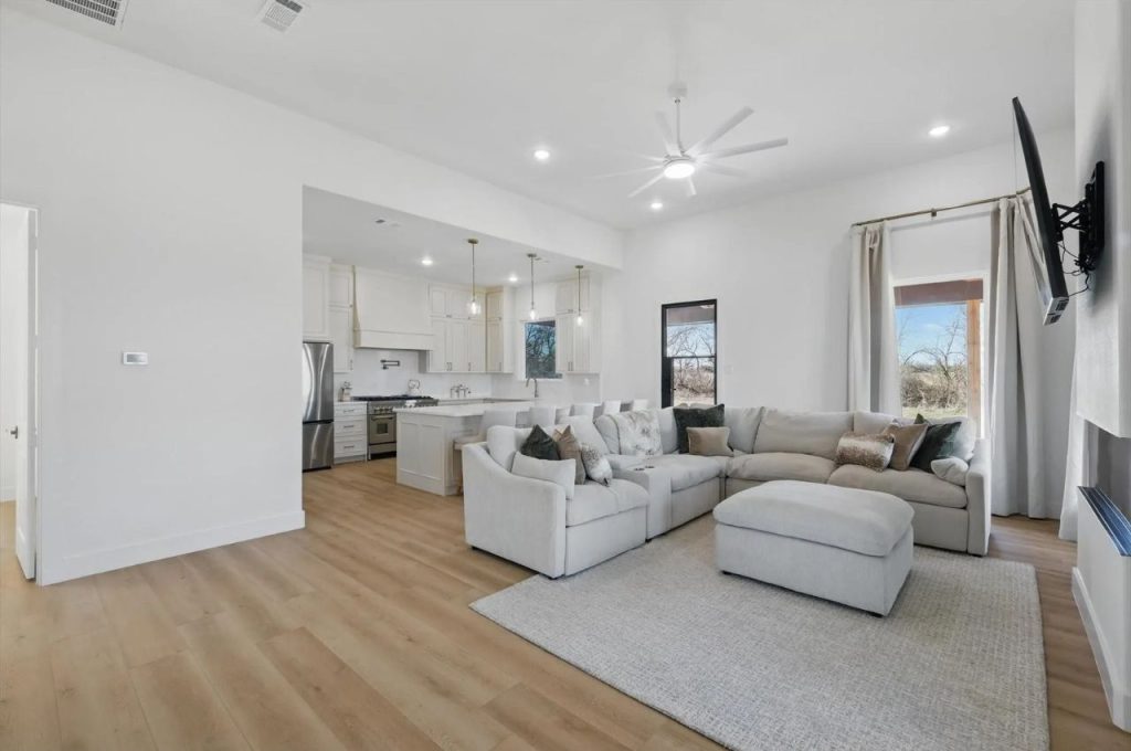 This bright and airy open-concept living space effortlessly blends comfort and sophistication. Crisp white walls and recessed lighting enhance the room’s spacious feel, while warm wood-look flooring adds a touch of inviting charm. The plush sectional creates a cozy gathering spot, positioned perfectly to enjoy the fireplace and mounted TV. Large windows and glass doors flood the space with natural light, offering scenic views of the surrounding landscape. Flowing seamlessly into the gourmet kitchen, this layout is perfect for entertaining, allowing for effortless interaction between cooking, dining, and relaxation.