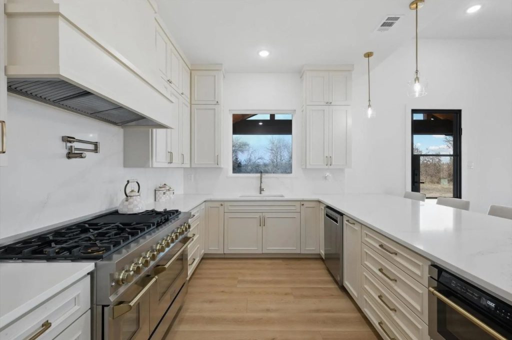 This gourmet kitchen combines classic elegance with modern convenience. Soft white cabinetry with gold hardware creates a timeless aesthetic, while the expansive quartz countertops offer ample workspace. A professional-grade gas range with a sleek vent hood and pot filler ensures effortless cooking, making it a dream for culinary enthusiasts. The large island provides additional prep space and seating, perfect for casual dining or entertaining. Pendant lighting adds warmth, while a picturesque window above the farmhouse sink frames scenic outdoor views, bringing natural beauty into this refined and functional space.