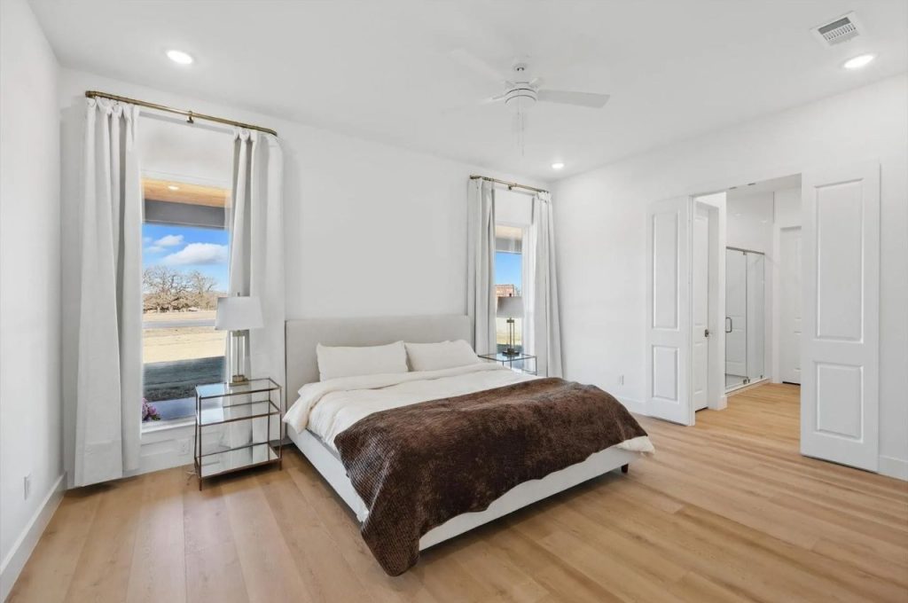 This tranquil bedroom is a perfect retreat, blending modern simplicity with warmth. Crisp white walls and natural wood flooring create an airy, inviting atmosphere, enhanced by recessed lighting and a ceiling fan for year-round comfort. Floor-to-ceiling windows framed by elegant drapes allow natural light to pour in while offering serene outdoor views. The plush upholstered bed serves as a cozy focal point, complemented by sleek mirrored nightstands. An ensuite bathroom, accessed through double doors, features a glass-enclosed shower and spacious walk-in closet, adding both luxury and practicality to this peaceful haven.