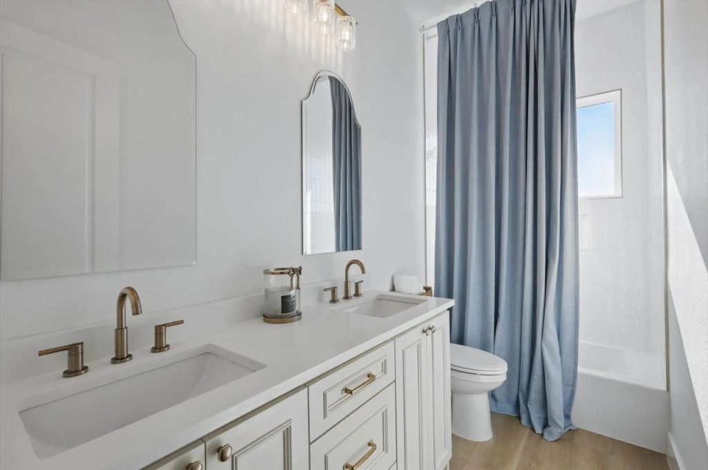 This serene bathroom blends elegance with functionality, featuring a crisp white double vanity with classic panel detailing and brushed brass hardware. Soft blue accents, from the flowing shower curtain to the subtle décor, add a calming touch. An arched mirror complements the graceful design, while glass light fixtures provide a warm, ambient glow. The brushed brass faucets and hardware bring a refined contrast against the white surfaces. Natural light from the window brightens the space, enhancing the airy feel. This bathroom is a perfect balance of sophistication and relaxation.