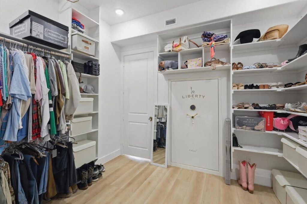 This spacious walk-in closet combines practicality with style, offering ample storage for clothing, shoes, and accessories. Thoughtfully arranged open shelving provides easy access to everyday essentials, while built-in hanging rods maximize organization. A sleek white Liberty safe is seamlessly integrated into the design, adding a unique and secure element. Light wood flooring brings warmth to the crisp white cabinetry, creating a bright and inviting atmosphere. With recessed lighting and a well-placed full-length mirror, this closet is both functional and elegant.