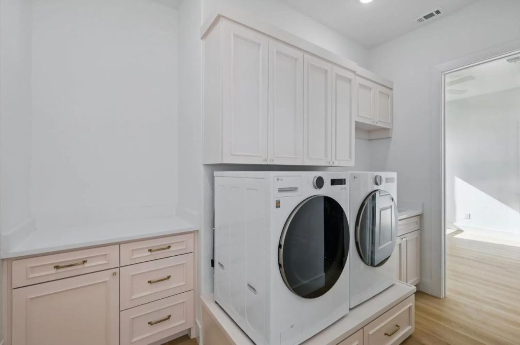 This pristine laundry room offers a streamlined, functional design with an all-white aesthetic. A sleek front-loading washer and dryer sit atop custom-built cabinetry, seamlessly integrating into the space while maximizing storage. Brass hardware adds a touch of elegance to the soft white cabinetry, which provides ample storage for laundry essentials. Expansive countertops offer convenient folding space, while additional cabinets above keep supplies neatly tucked away. With natural light streaming in from an adjacent room, this laundry area is both practical and inviting.