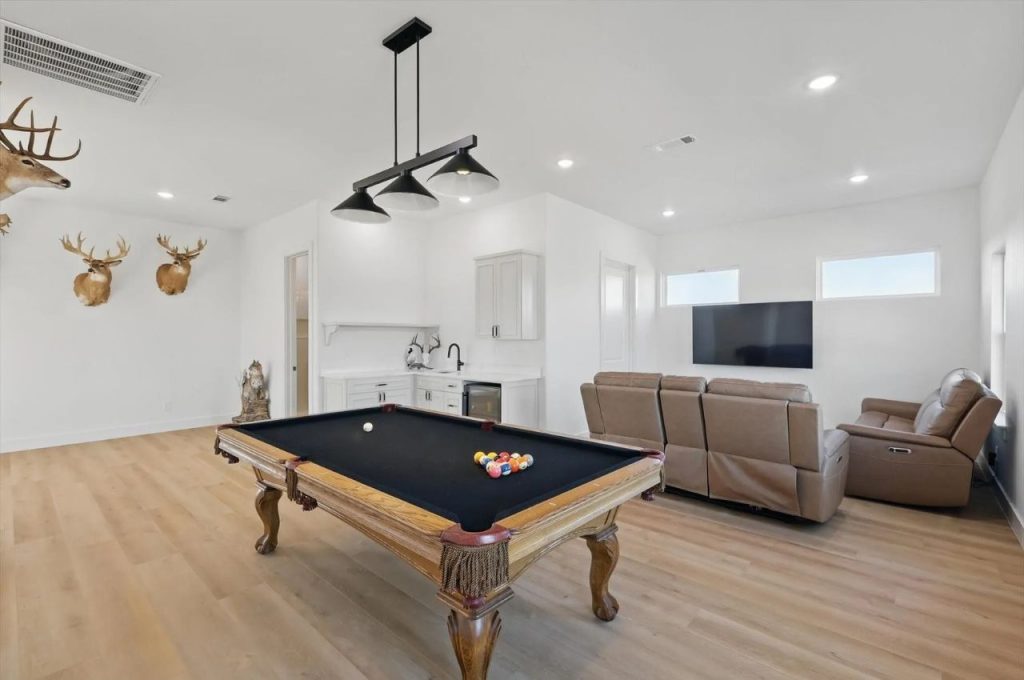 This inviting game room blends recreation and relaxation with a stylish yet comfortable design. A classic wooden pool table with a sleek black felt top serves as the focal point, illuminated by a modern industrial-style light fixture. The open layout extends to a cozy seating area with plush reclining sofas facing a mounted flat-screen TV, perfect for unwinding. A built-in wet bar with crisp white cabinetry and a mini fridge adds convenience for entertaining. Light wood flooring and mounted deer heads enhance the room’s warm, lodge-inspired aesthetic, creating an ideal space for leisure and gatherings.