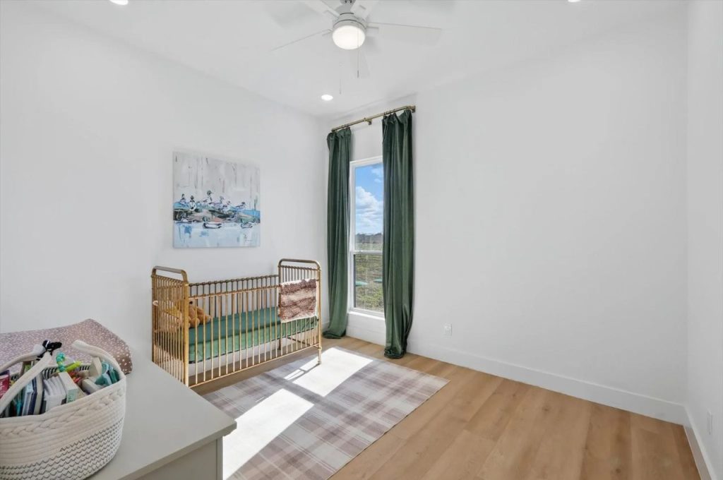 This bright and airy nursery embraces a minimalist aesthetic with soft natural tones. A sleek gold crib serves as a stylish centerpiece, paired with deep green drapery that adds warmth and contrast against the crisp white walls. Sunlight pours in through the large window, illuminating the light wood flooring and a cozy plaid area rug. A subtle yet charming painting above the crib enhances the room’s tranquil ambiance. With thoughtful touches like a woven basket of essentials and a soft teddy bear, this space blends functionality with serene elegance, creating a peaceful retreat for your little one.