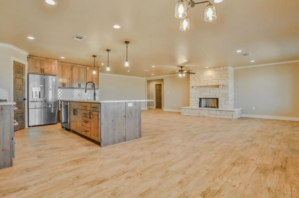 This warm and inviting open-concept space blends rustic elements with modern functionality. The kitchen features knotty wood cabinetry, a stylish subway tile backsplash, and a spacious island with contrasting tones, offering ample prep space. Pendant lighting adds a touch of elegance, while stainless steel appliances provide a sleek, contemporary feel. The stone fireplace with a wood mantel serves as a cozy focal point, enhancing the room’s character. Wood-look flooring, recessed lighting, and a ceiling fan with warm accent lighting complete this harmonious, well-balanced design.