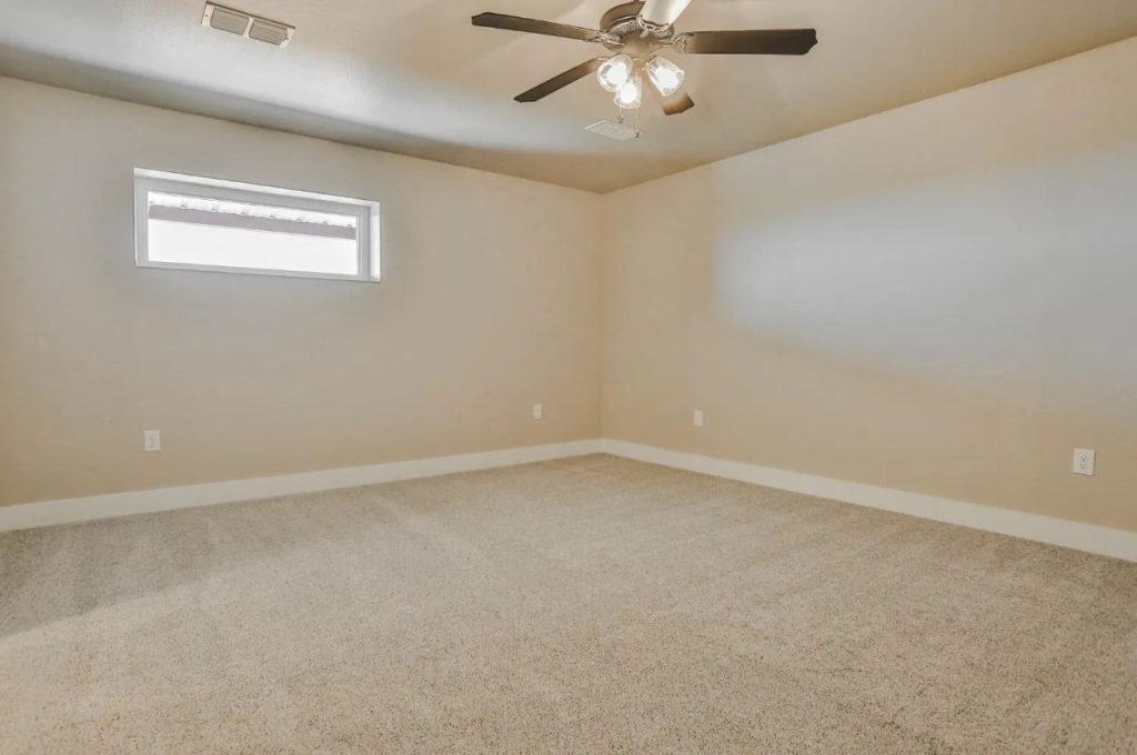 This versatile bedroom offers a neutral color palette that serves as a perfect blank canvas for any style. The plush carpeting enhances comfort underfoot, while the trimmed baseboards add a polished touch. A modern ceiling fan with built-in lighting ensures year-round comfort and illumination. The high-set window allows natural light to filter in while maintaining privacy. With its spacious layout and clean design, this room is ready to be personalized into a serene retreat, a functional home office, or a cozy guest space.