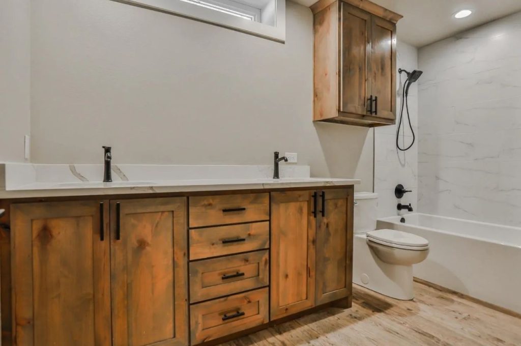 This beautifully designed bathroom blends rustic charm with modern elegance. The warm wood cabinetry provides ample storage while complementing the marble-look quartz countertop. Matte black fixtures contrast beautifully against the light neutral walls, adding a contemporary touch. A deep soaking tub with a sleek black showerhead is framed by large-format marble-style tiles, enhancing the spa-like ambiance. The wood-look flooring ties the space together, creating a cozy yet sophisticated retreat. Thoughtful details, including a floating upper cabinet, maximize both style and functionality.