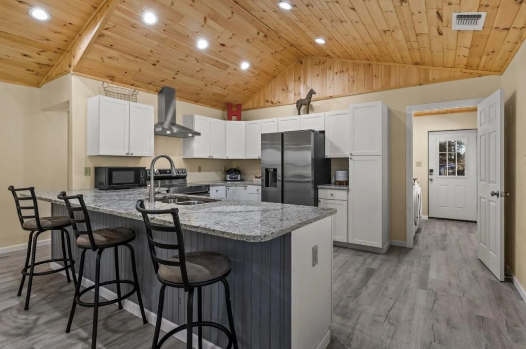 This inviting kitchen perfectly balances modern elegance with rustic warmth. A vaulted knotty pine ceiling enhances the open feel, while recessed lighting ensures a bright and welcoming space. Crisp white shaker cabinets provide ample storage, complemented by sleek stainless steel appliances and a striking vent hood. The granite countertops extend into a spacious island with bar seating, ideal for casual dining or entertaining. A soft gray beadboard base adds depth and charm, tying in beautifully with the wood-look flooring that flows seamlessly throughout the space.