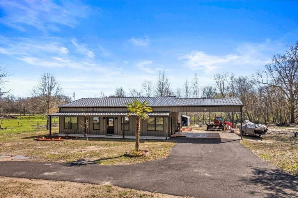 A charming 3-bedroom, 2-bathroom Bardominium built in 2024 nestled in the serene countryside of Winnsboro, Texas. This 1,600-square-foot barndominium sits on a generous 1.79-acre lot, offering ample space for outdoor activities and future expansions. Its sleek metal exterior and standing-seam roof provide both durability and style, while the inviting covered wraparound porch adds a welcoming touch. Large windows flood the interior with natural light, enhancing the home’s airy feel. A spacious attached carport offers room for vehicles, equipment, or projects, while the surrounding landscape features open greenery and mature trees. Blending modern convenience with rural tranquility, this home is the perfect retreat for those seeking a peaceful yet functional lifestyle.