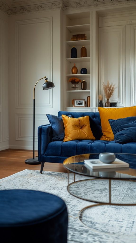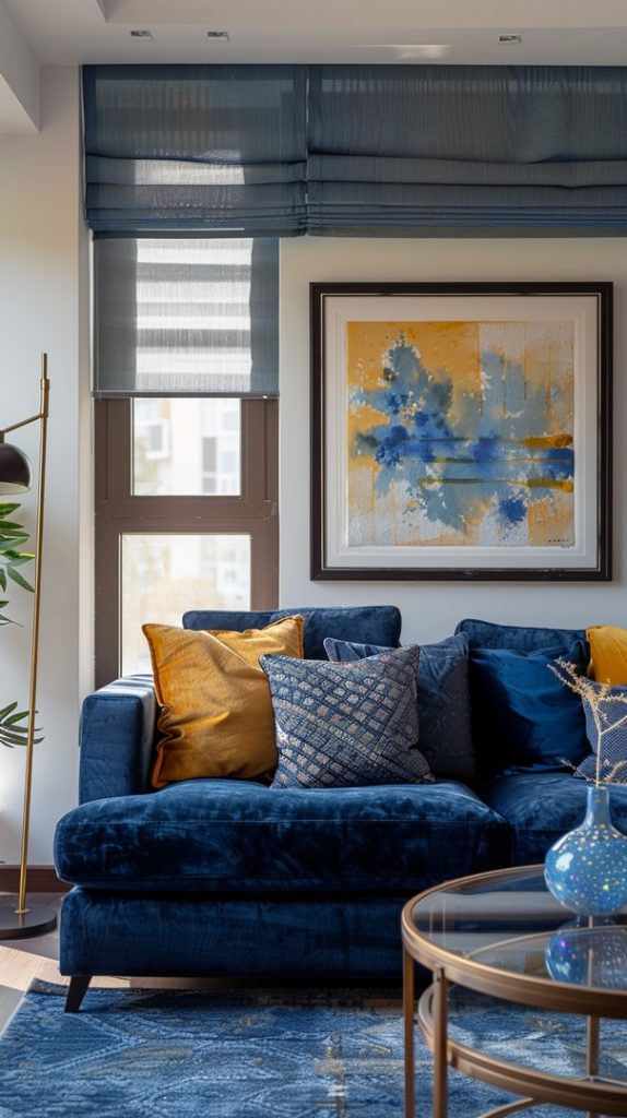 Create a cozy living space with a blue velvet sofa adorned with mustard and blue patterned pillows. Natural light flows through blue Roman shades and beige curtains. A black and gold floor lamp adds sophistication, while built-in shelves display blue ceramic vases. A plush blue area rug and modern glass coffee table complete the inviting look, with fresh orange flowers adding a touch of nature.