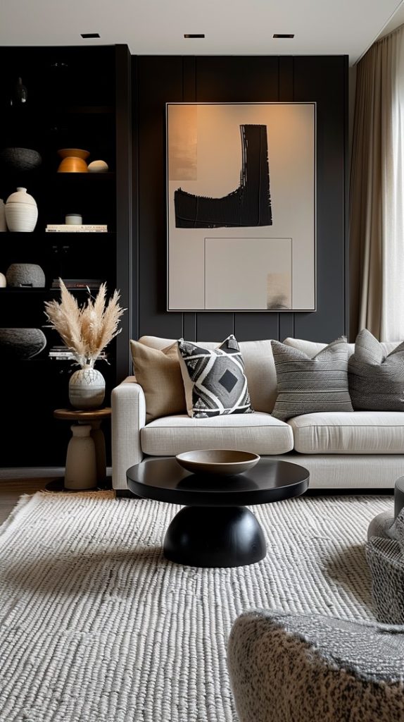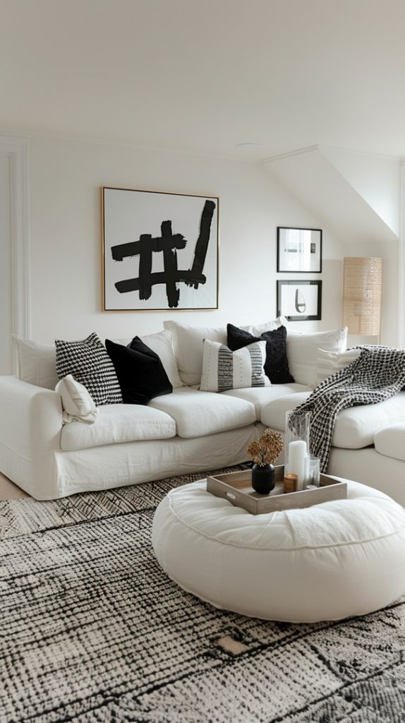 Achieve a minimalist yet cozy look with this black and white living room. A spacious white sectional with monochrome pillows sits atop a textured rug. Black abstract art and modern decor elements, including a round ottoman and tray with candles, enhance the serene and inviting ambiance.