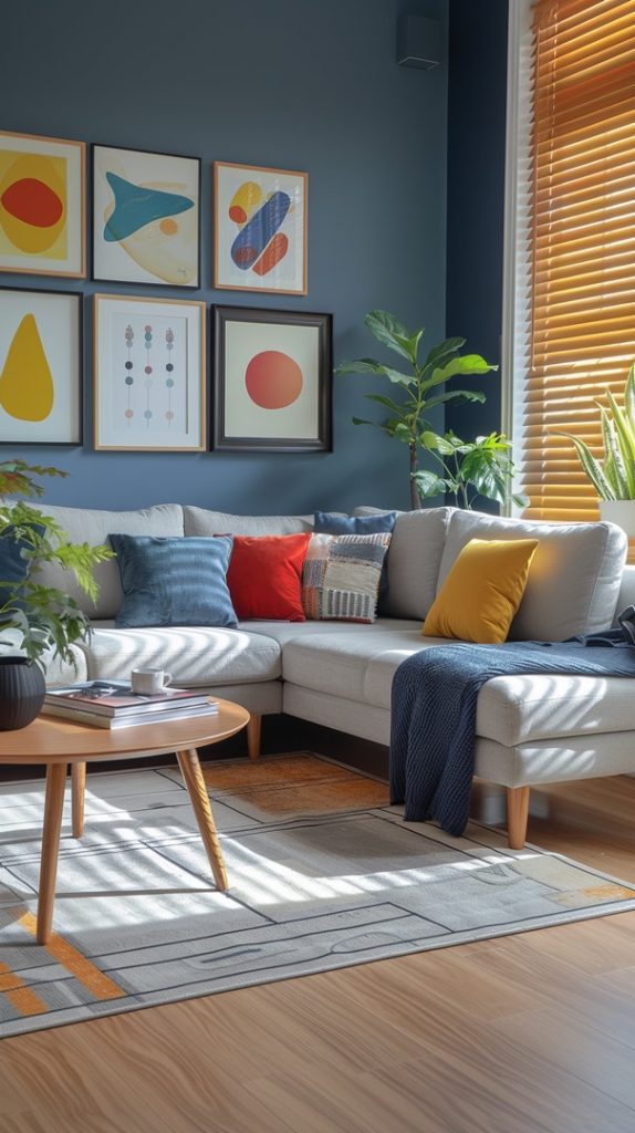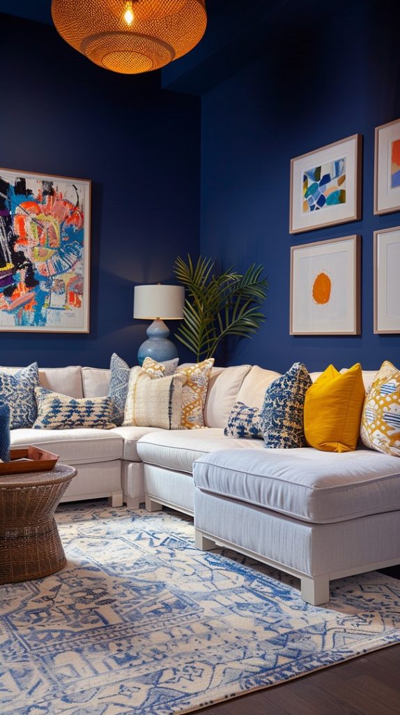Brighten your living space with this colorful and cozy room featuring a white sectional sofa with vibrant pillows. Deep blue walls provide a bold backdrop for eclectic artwork, while a woven coffee table and patterned rug add texture. A large pendant light completes the inviting atmosphere.