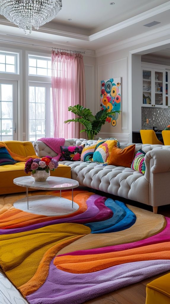 This living room bursts with vibrant colors and cozy vibes. A mustard yellow velvet sofa stands out against an abstract, multicolored mural on the wall. The sofa is adorned with plush throw pillows in shades of pink and purple, enhancing the room’s inviting atmosphere. A round, pink upholstered coffee table complements the colorful area rug beneath it, which features bold geometric patterns. On the side, a simple wooden table holds a vase with fresh pink and purple flowers, adding a touch of nature to the vibrant setting. The overall effect is a lively and comfortable space, perfect for relaxation and inspiration..
