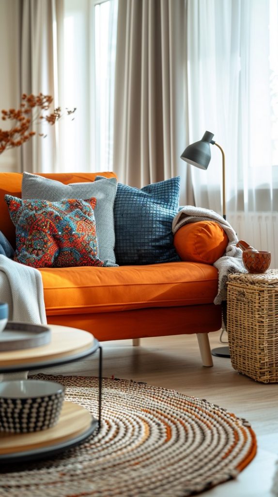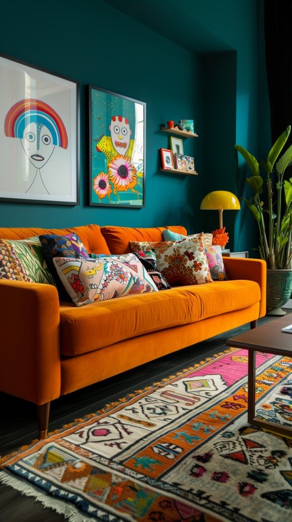 This eclectic living room showcases a bright orange sofa with colorful patterned pillows, set against teal walls. Unique artwork and a mix of textures create a vibrant and cozy space. A patterned rug and indoor plants add warmth and character, making it perfect for relaxation and creativity.