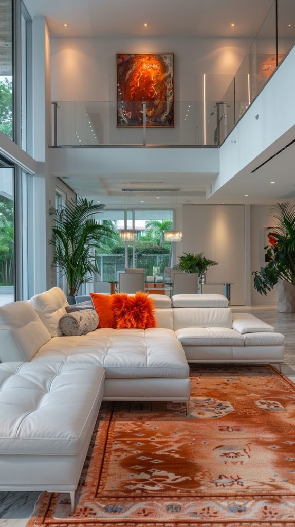 This luxurious living room features a white sectional sofa accented with vibrant orange pillows. Large windows flood the space with natural light, highlighting the high ceilings and modern decor. An orange-patterned rug adds warmth, while greenery and abstract art complete the cozy and sophisticated look.