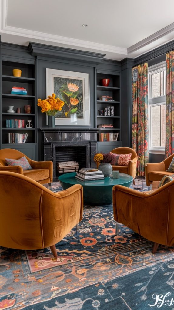 Create a warm and cozy library-like atmosphere with this living room featuring rich blue walls and plush mustard armchairs. A fireplace with a marble mantel serves as the focal point, while built-in shelves filled with books add character. Floral curtains and a patterned rug enhance the inviting feel.