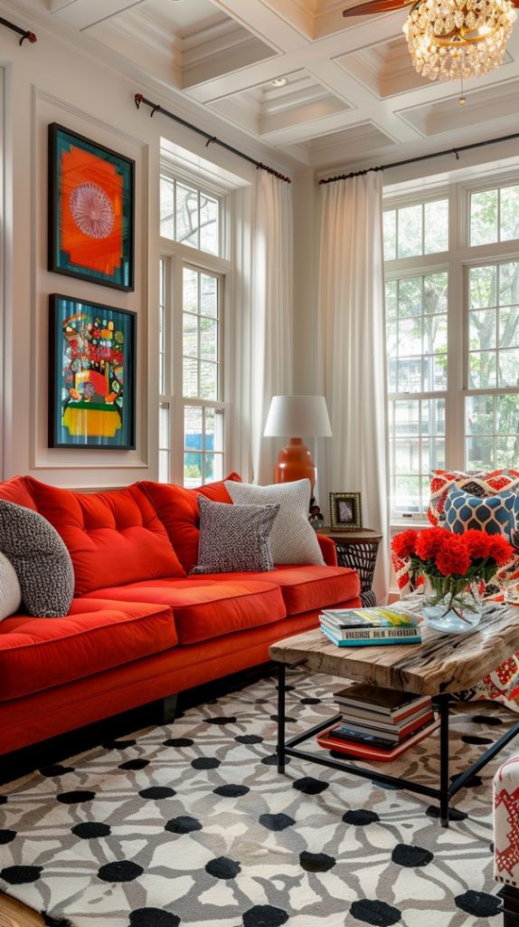 Infuse brightness into your home with this cozy red living room. A vibrant red sofa is paired with patterned pillows and a neutral rug. Large windows with white curtains allow natural light to illuminate the space, while colorful wall art and a wooden coffee table add warmth and charm.