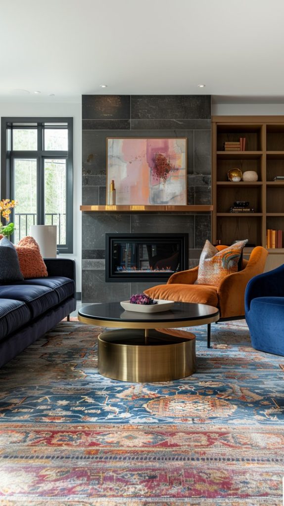 This sophisticated living room combines contemporary design with cozy elements. A deep blue sofa is complemented by an orange accent chair and a round coffee table. A modern fireplace with a sleek mantel and abstract art adds elegance, while a patterned rug enhances the inviting ambiance.