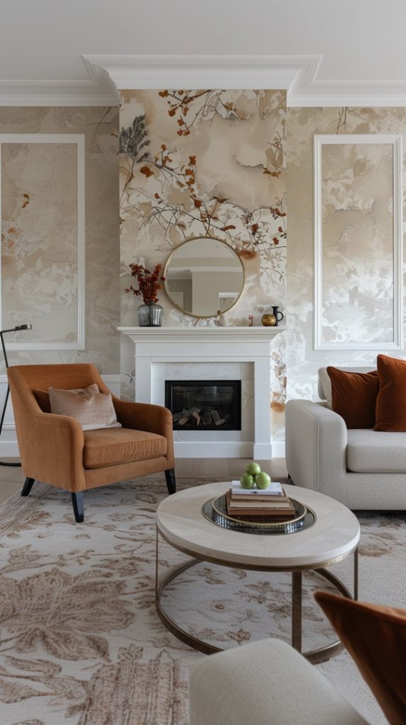 This living room embodies serene elegance with its neutral palette and sophisticated decor. The focal point is a beautifully designed fireplace with a round mirror above it, flanked by autumn-inspired wallpaper. A comfortable armchair in a warm, earthy tone and a plush sofa with coordinating throw pillows create an inviting seating area. The round coffee table, adorned with books and a bowl of green apples, complements the room’s refined aesthetic. Soft, muted tones on the walls and rug enhance the tranquil atmosphere, making it a perfect space for relaxation.