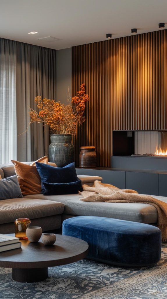 Embrace earthy tones in this warm and cozy living room. A gray sectional sofa is paired with blue and rust-colored pillows. The wooden slat wall and large ceramic vases add a natural touch, while a soft rug and ambient lighting create a serene and inviting atmosphere.