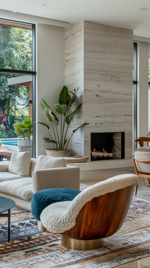 This living room exudes modern elegance with its sleek design and cozy elements. The neutral-toned sofa and chairs are complemented by a striking fireplace and lush green plants, creating a harmonious blend of comfort and style. The unique chair with its wooden base and soft upholstery adds a touch of luxury, making this space both inviting and sophisticated.