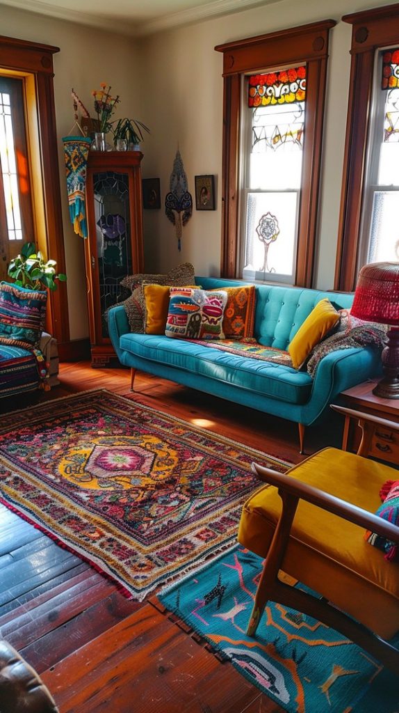 This living room showcases an eclectic blend of vibrant colors and textures, creating a cozy and inviting atmosphere. The mustard yellow armchair paired with a deep teal sofa adds a bold touch, while the colorful patterned rug ties the room together. Accentuated by wooden elements and a warm, soft light from the lamp, this space exudes a charming and homey vibe, perfect for relaxation and comfort.