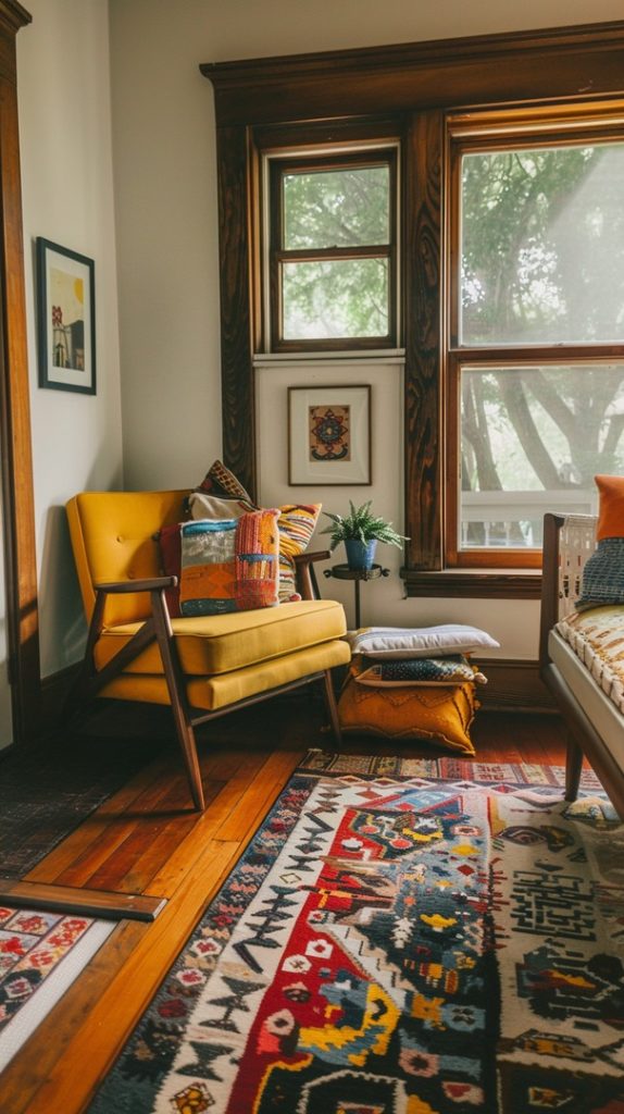 This inviting living space is highlighted by a mustard yellow armchair, perfect for a cozy reading nook. The room is bathed in natural light from the large windows, creating a warm and welcoming ambiance. The vibrant, patterned rug adds a touch of color and complements the lush green plants that bring nature indoors. The eclectic mix of cushions and wall art add a personal and playful touch, making this a perfect spot to relax and unwind