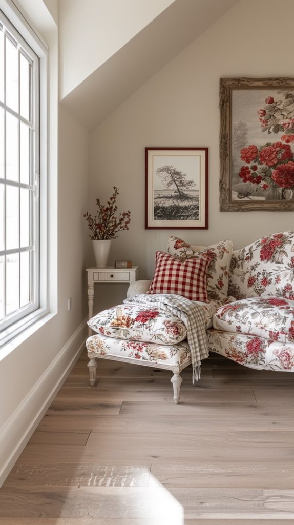 This cozy corner features a comfortable armchair adorned with a charming floral print, perfect for reading or relaxing. The neutral tones of the room are complemented by the warm, natural light streaming in from the large window. The classic checkered cushion and throw add a touch of rustic charm, while the botanical artwork on the walls ties the room together, creating a serene and inviting atmosphere.