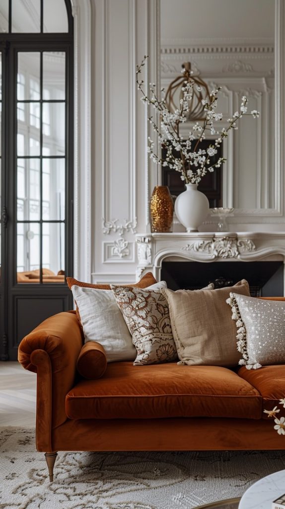 This elegant living room exudes a classic charm with its sophisticated decor and refined color palette. The plush, rust-colored velvet sofa serves as a luxurious centerpiece, adorned with an assortment of textured pillows in neutral tones. A beautifully ornate white mantelpiece, complete with intricate moldings, frames a decorative arrangement of vases and floral branches, adding a touch of nature and art. The room is bathed in natural light, highlighting the detailed architectural elements and creating a serene, inviting ambiance.
