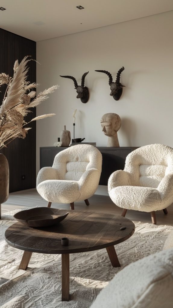 This modern minimalist living room exudes a sense of calm and sophistication with its clean lines and neutral color palette. The focal point is a pair of plush, cream-colored armchairs, featuring a textured, cozy fabric that invites relaxation. The chairs are complemented by a rustic wooden coffee table and a matching console, which displays an array of artistic sculptures and natural elements. On the wall, a pair of antelope horn mounts and a stylized head sculpture add a touch of eclectic charm. The room is subtly accented with dried botanical arrangements, enhancing the organic, serene atmosphere.